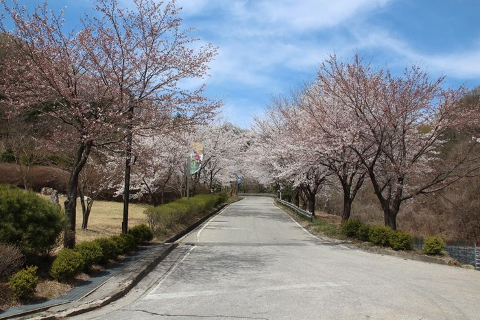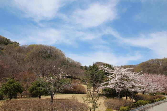 따뜻한 날씨에 벚꽃이 피고, 모처럼 맑은 하늘이 보입니다.