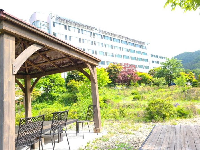 정자1 : 정문에 위치한 정자1은 가장 역사가 깊을 뿐만 아니라 잔디밭과 철쭉, 벚나무 등 다양한 볼거리, 즐길거리들이 있어 환우들과 방문객으로부터 사랑받는 곳입니다. 접근성이 좋아 산책 후 잠시 쉬며 회복하기엔 최고의 장소죠.