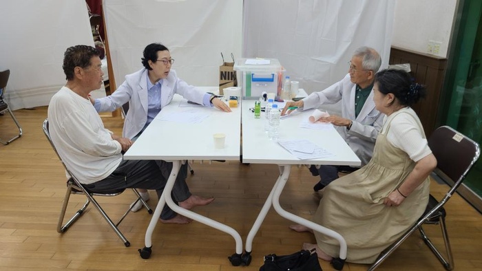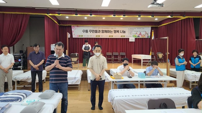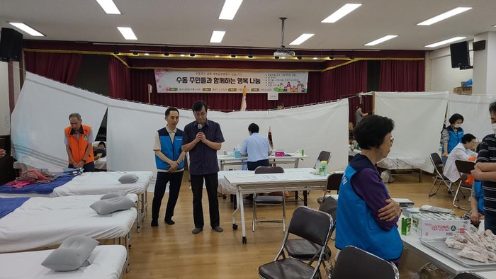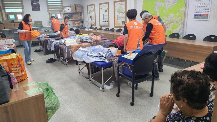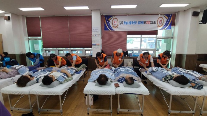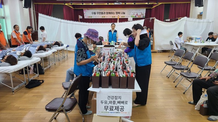 지난 6월23일(일) 오후2시~5시까지 수동 물골안노인회관에서 수동주민들을 위한 의료봉사(가정의학과,한방치료,도수치료,뜸,인바디,혈당체크) 및 발마사지, 미용, 칼갈이, 와플과 두유 나눔 봉사가 진행되었습니다. 이 일을 위해 여러 직원들과 원주 하늘나들목센터 봉사팀이 협력하였고 60명 이상의 지역민들에게 봉사가 이루어졌으며 좋은 반응을 얻었습니다!